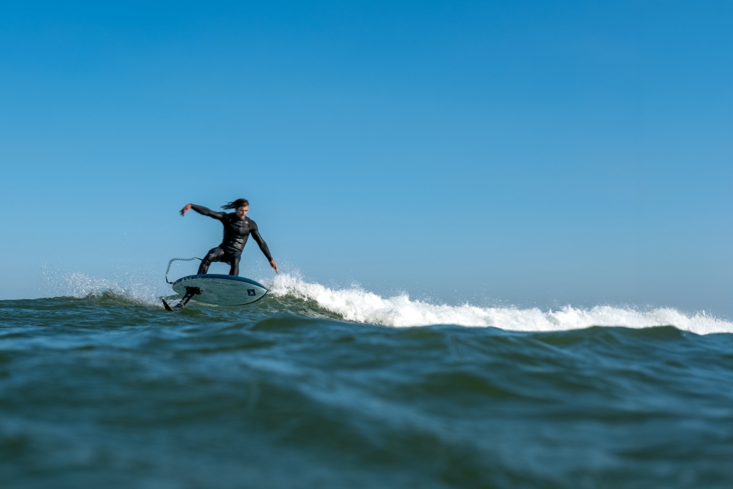 The concave deck makes it feel much more stable and comfortable when paddling. This allows you to push your chest forward to generate speed when paddling into the waves, while keeping the board stable. It also makes you feel more connected to the foil with the advantage of the extra volume on the rails for stability.