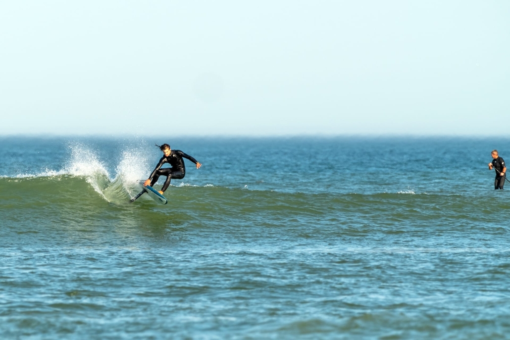 AK Phazer V5 foilboard hydrofoiling in big wavesAK Phazer V5 foilboard hydrofoiling in waves seen from behindAK Phazer V5 foilboard hydrofoiling in small waves